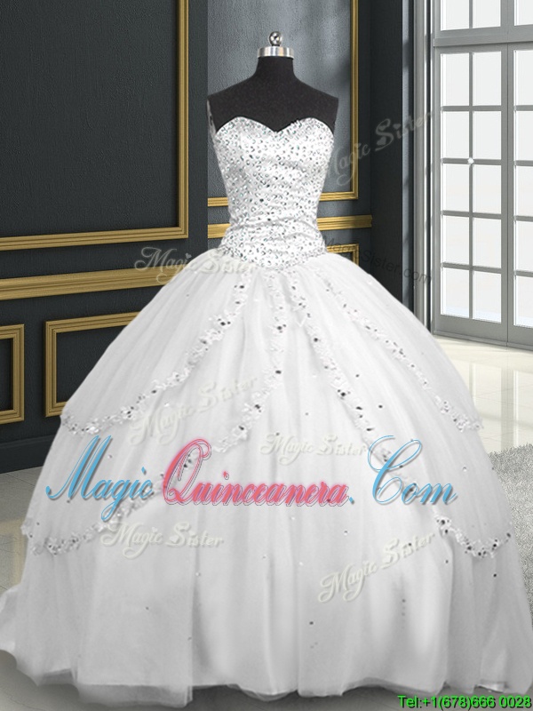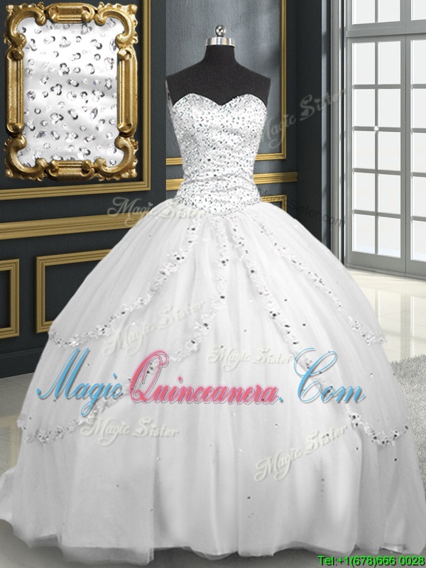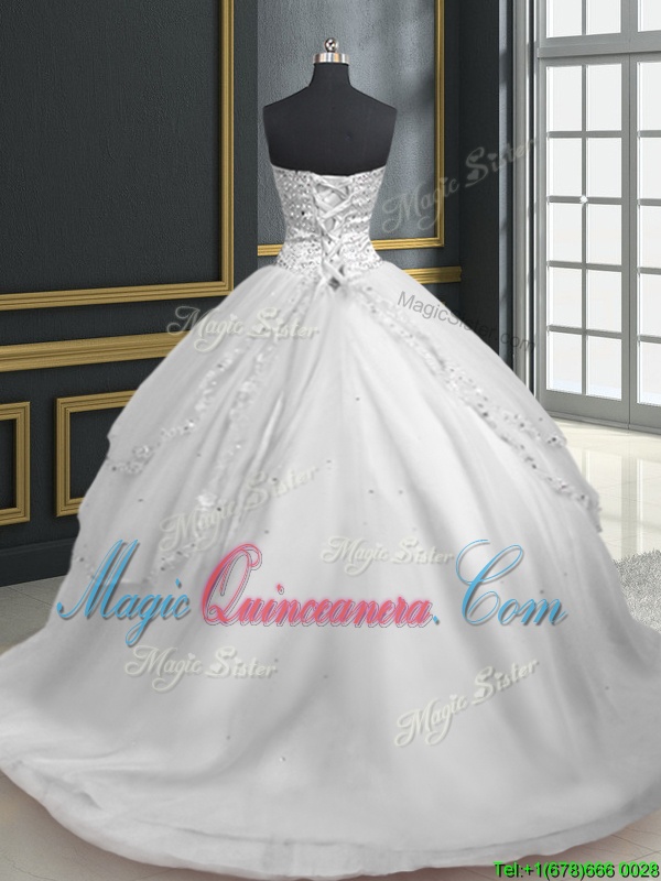 Charming Sleeveless Tulle With Brush Train Lace Up 15 Quinceanera Dress in White for with Beading and Appliques