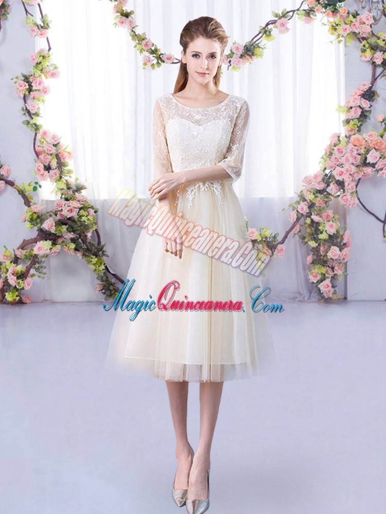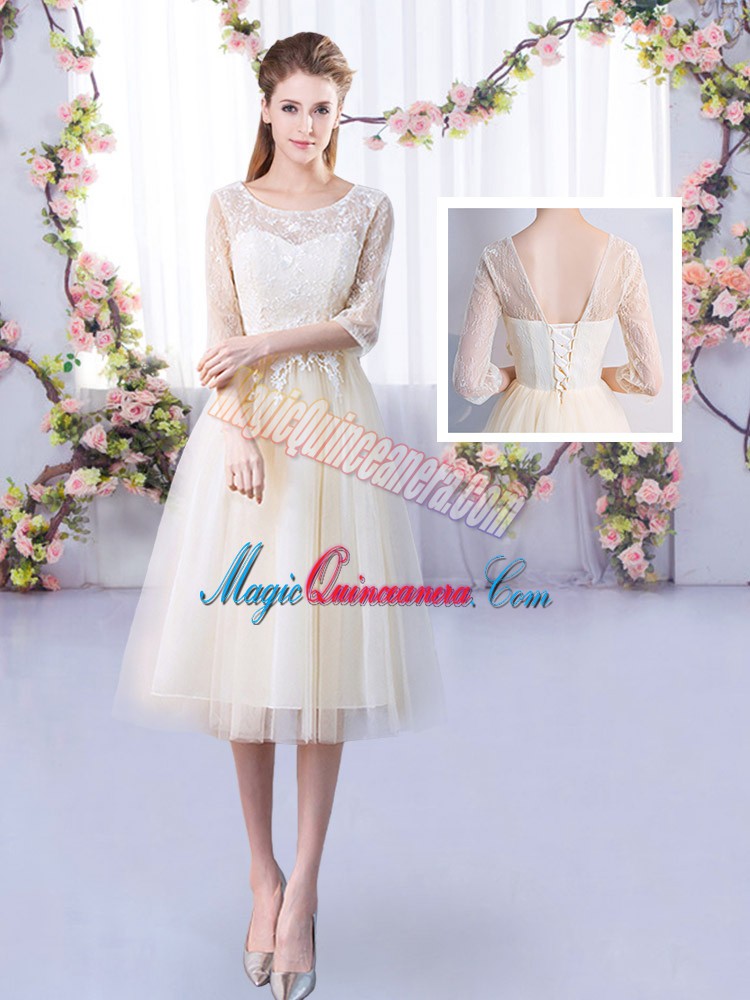 , Cheap Champagne Lace Up Scoop Lace Dama Dress Tulle Half Sleeves