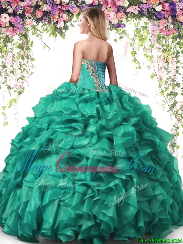 Cheap Fuchsia Ball Gowns Organza Sweetheart Sleeveless Beading and Ruffles Floor Length Lace Up 15th Birthday Dress
