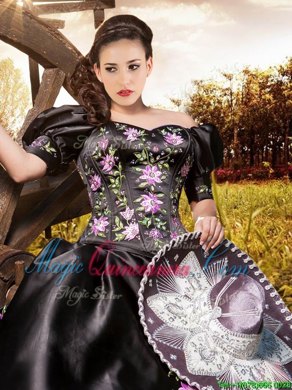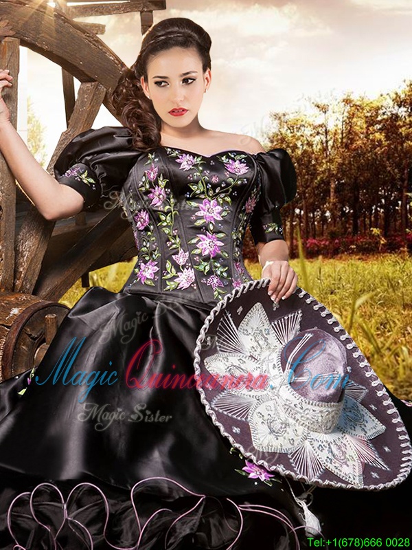 Cheap Off the Shoulder Black Short Sleeves Embroidery and Ruffles Floor Length Quinceanera Dress
