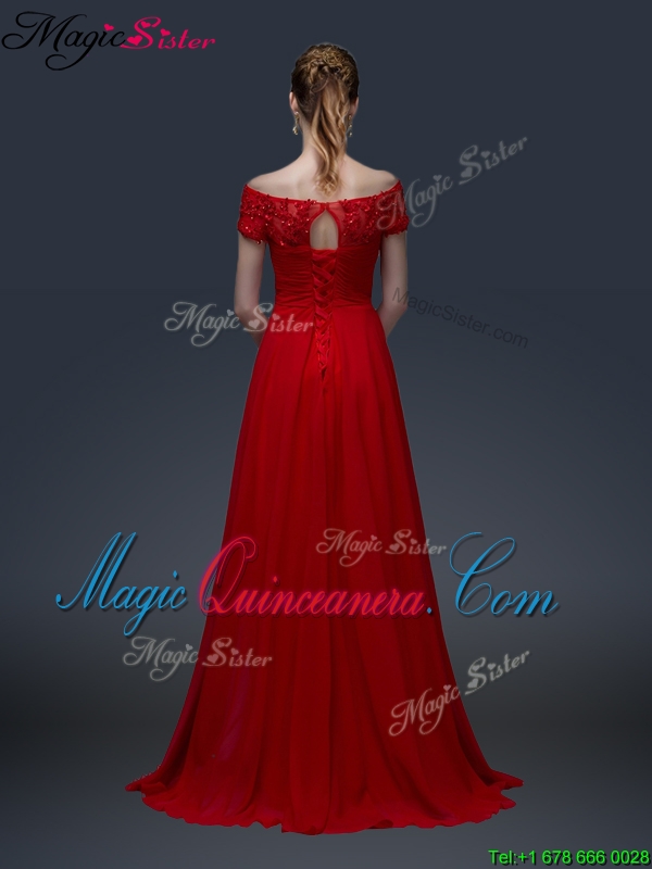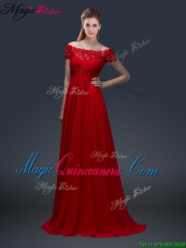 Cheap Off the Shoulder Short Sleeves Red Mother of the Bride Dresseswith Appliques