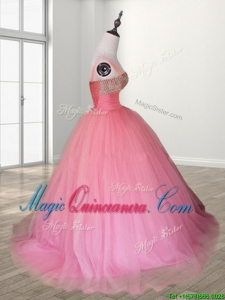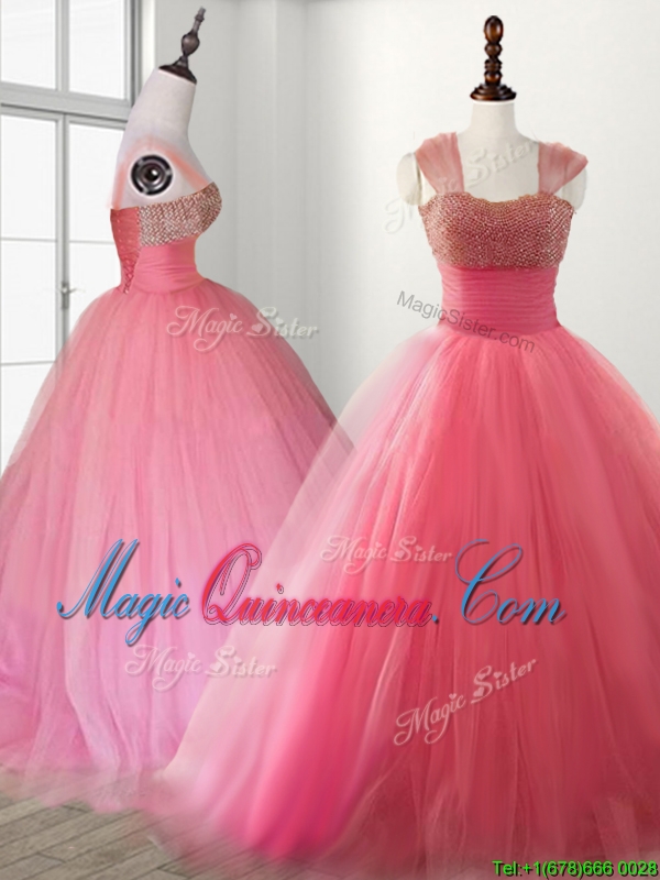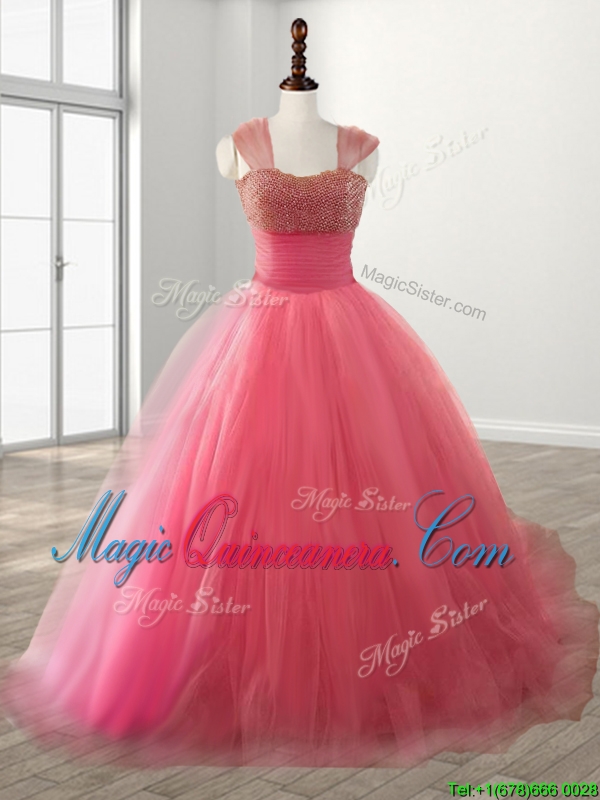 Cheap Straps Beading Brush Train Quinceanera Dress in Watermelon Red