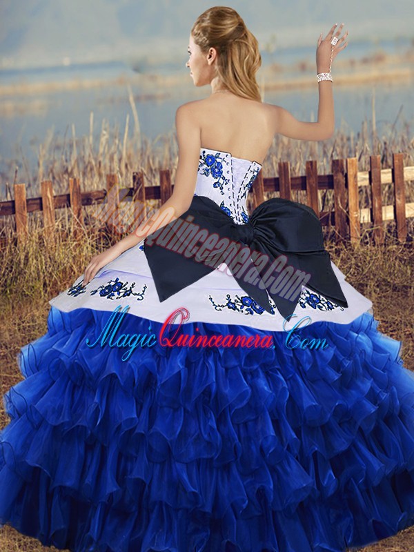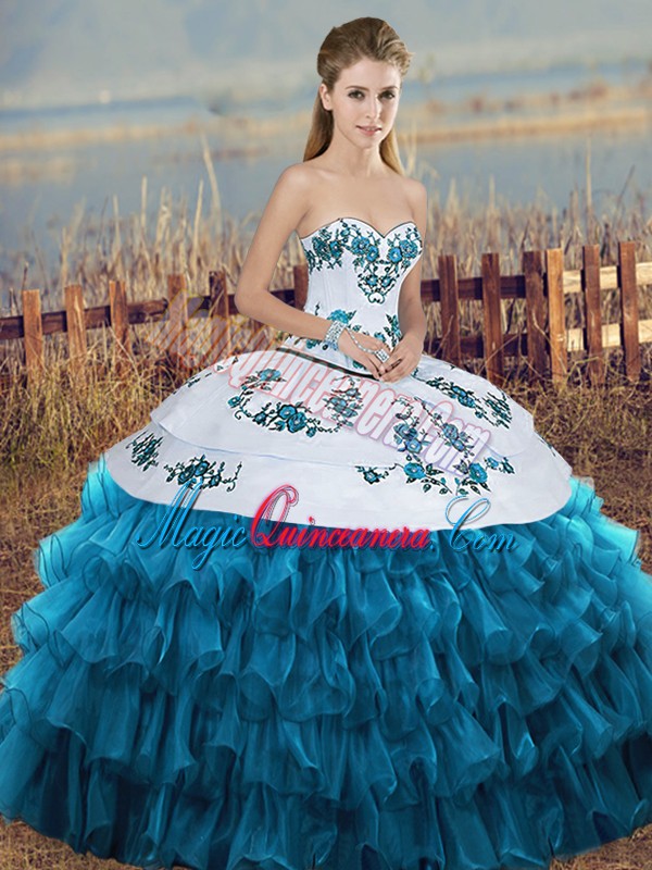 Cheap Sweetheart Sleeveless Organza Quince Ball Gowns Embroidery and Ruffled Layers and Bowknot Lace Up