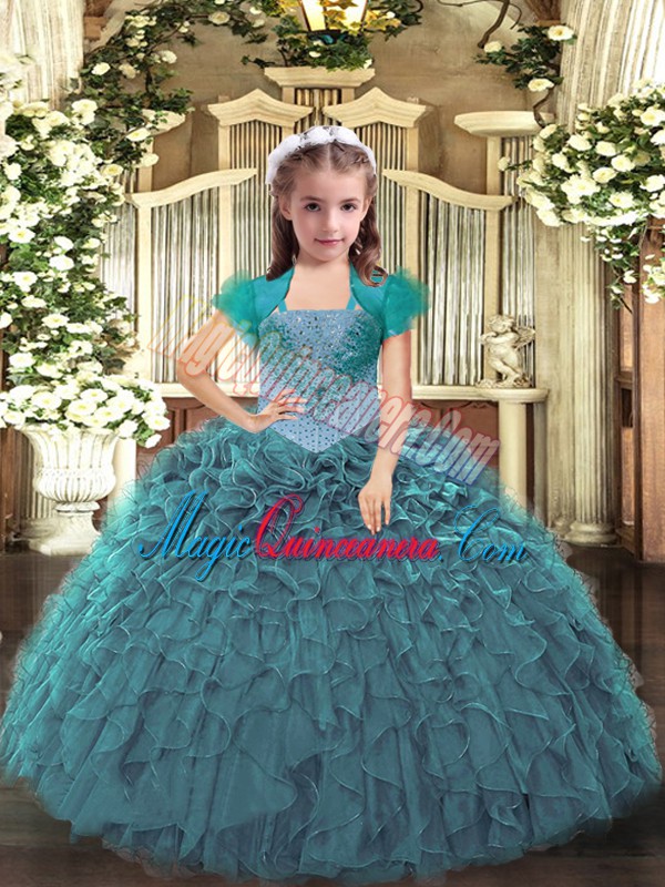 Cheap Teal Organza Lace Up Straps Sleeveless Floor Length High School Pageant Dress Beading and Ruffles