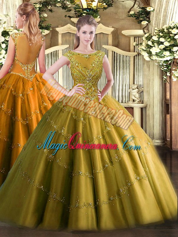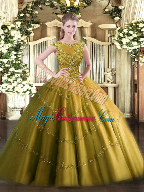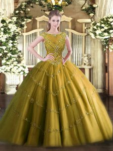 , Chic Floor Length Brown Quince Ball Gowns Tulle Sleeveless Beading and Appliques