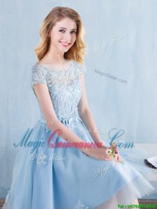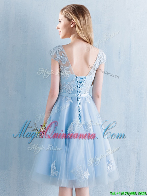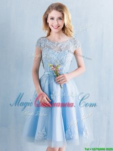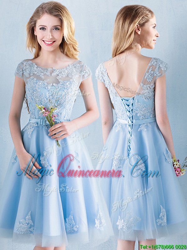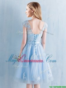 Chic Scoop Light Blue Tulle Lace Up Vestidos de Damas Short Sleeves Knee Length Appliques and Bowknot
