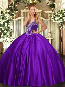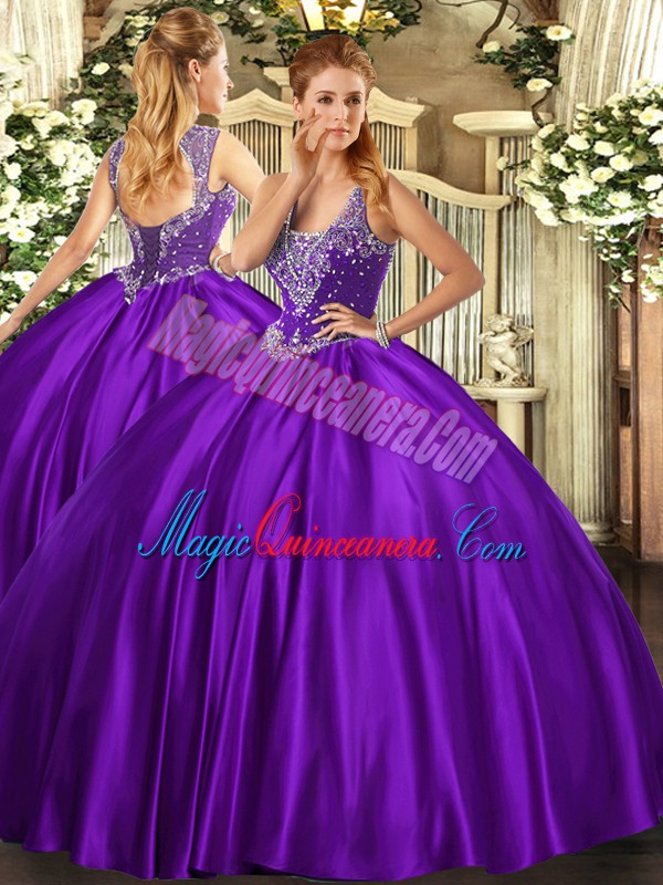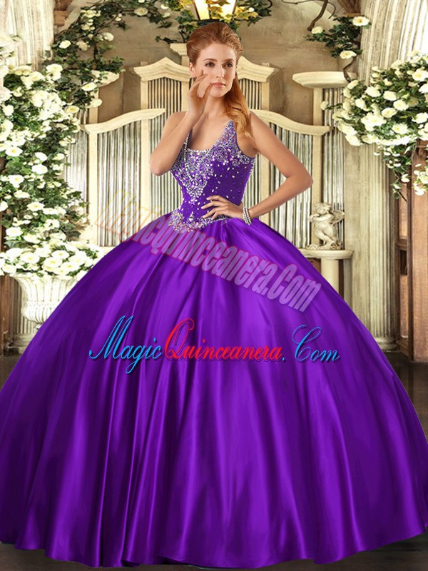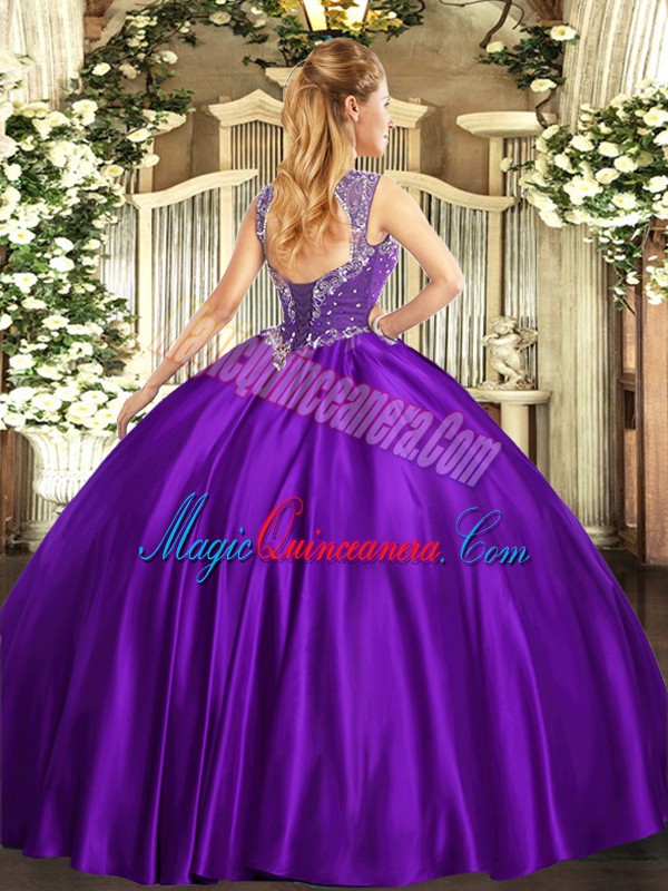Chic Sleeveless Satin Floor Length Lace Up Vestidos de Quinceanera in Purple with Beading