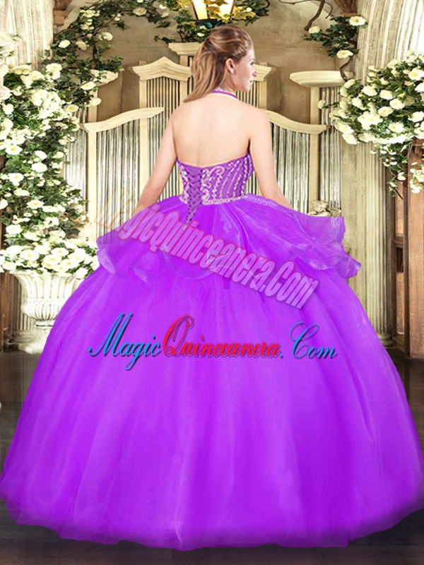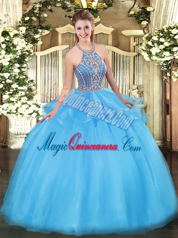 Classical Halter Top Sleeveless Quinceanera Gown Floor Length Beading and Ruffles Aqua Blue Tulle