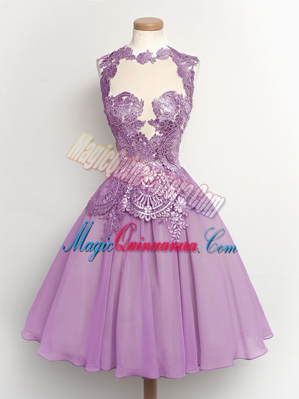 Classical Lilac Chiffon Lace Up Dama Dress for Quinceanera Sleeveless Knee Length Lace