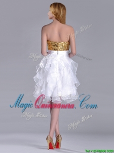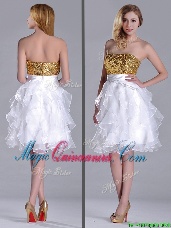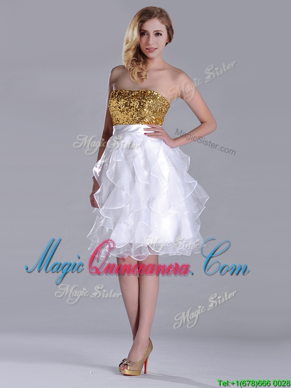 , Classical Organza Sequined and Ruffled Dama Dress in White and Gold
