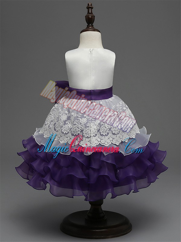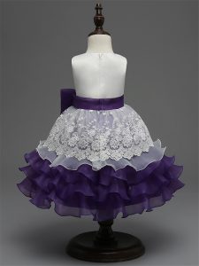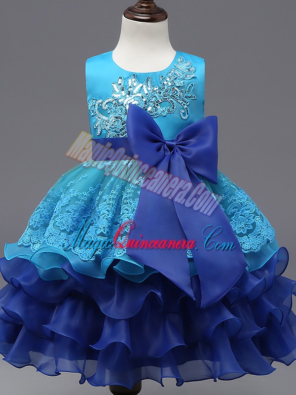 Classical Royal Blue Ball Gowns Lace and Ruffled Layers and Bowknot Winning Pageant Gowns Zipper Organza Sleeveless Tea Length