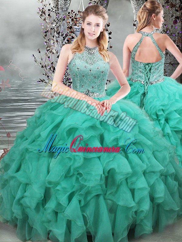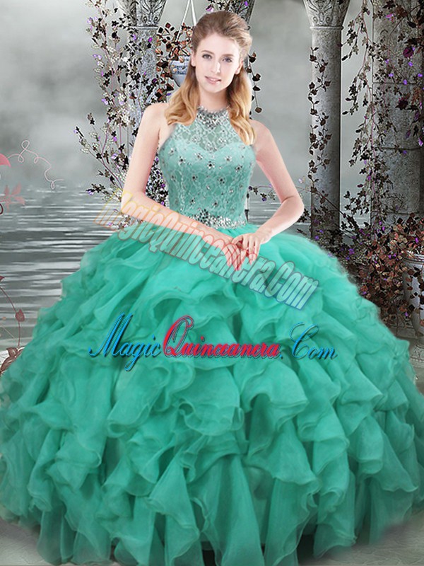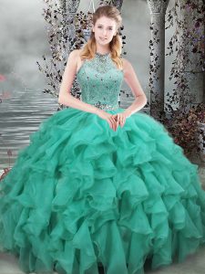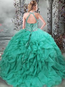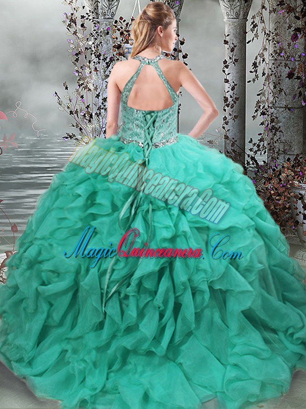 Classical Sleeveless Beading and Ruffles Lace Up Sweet 16 Dress with Turquoise Brush Train