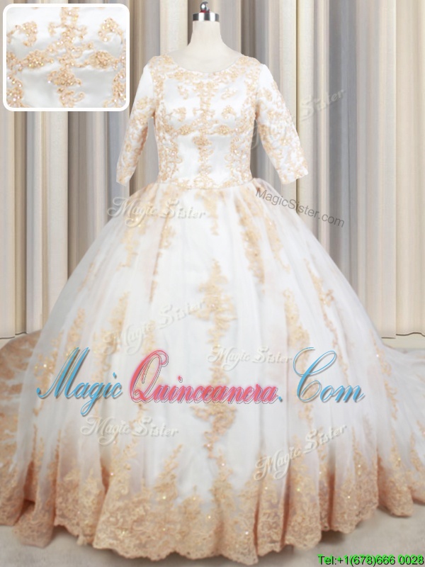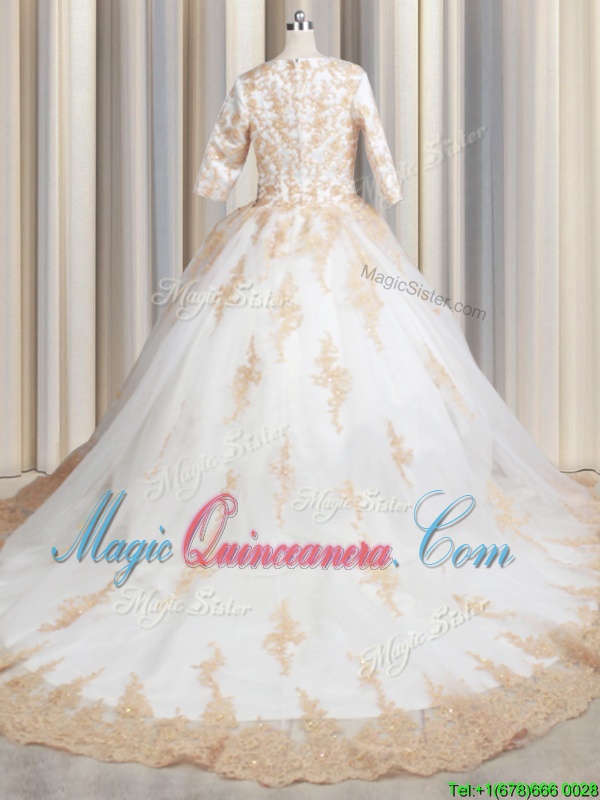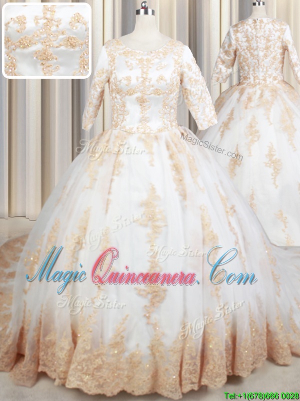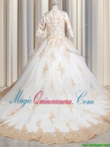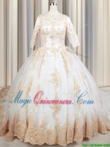 Clearance Scoop White Tulle Zipper Quince Ball Gowns Half Sleeves Court Train Beading and Lace and Appliques