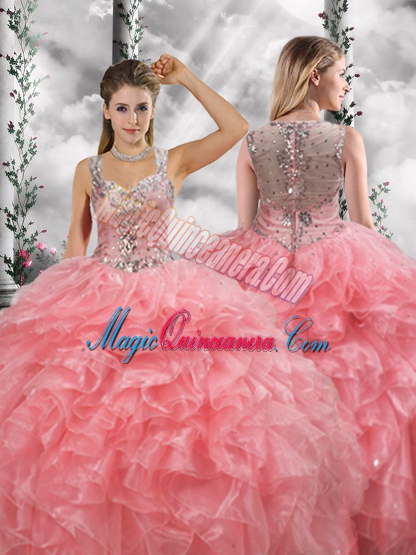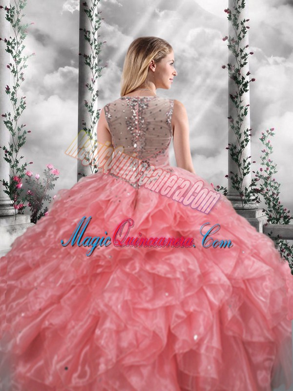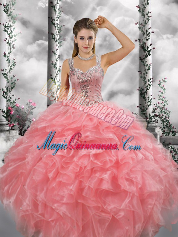 Colorful Beading and Ruffles Quinceanera Dresses Watermelon Red Zipper Sleeveless Floor Length