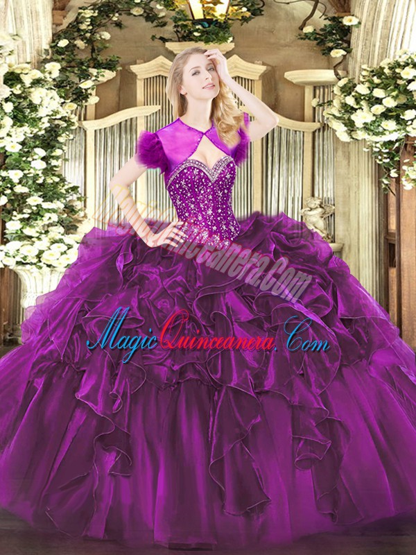 Colorful Purple Lace Up Sweetheart Beading and Ruffles Quince Ball Gowns Organza Sleeveless