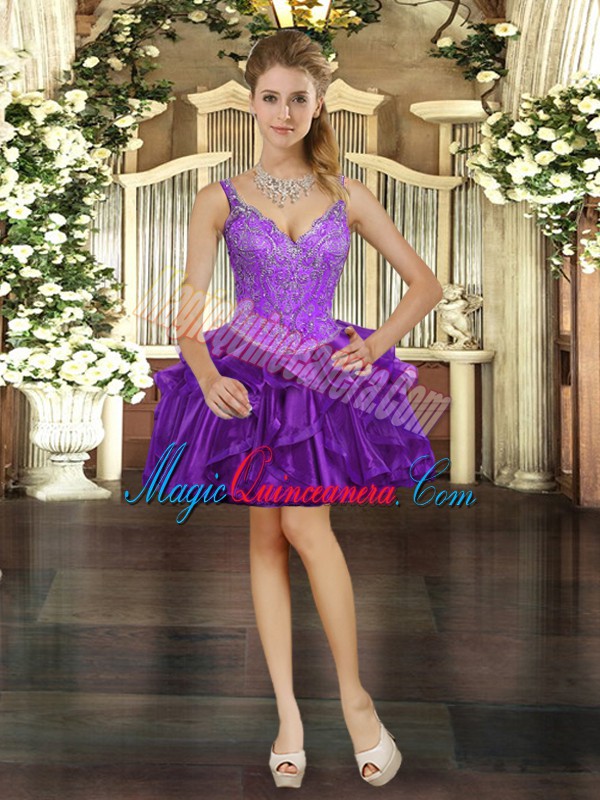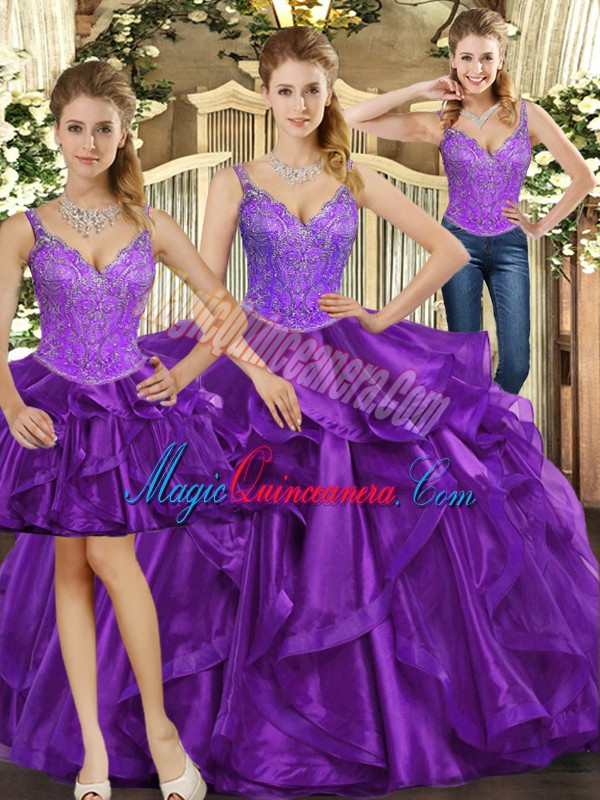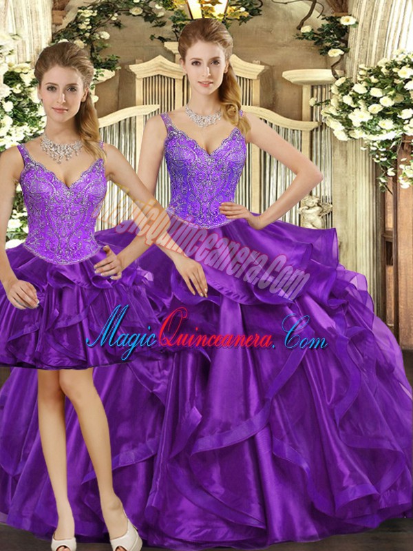 Colorful Purple Organza Lace Up Quinceanera Dress Sleeveless Floor Length Beading and Ruffles