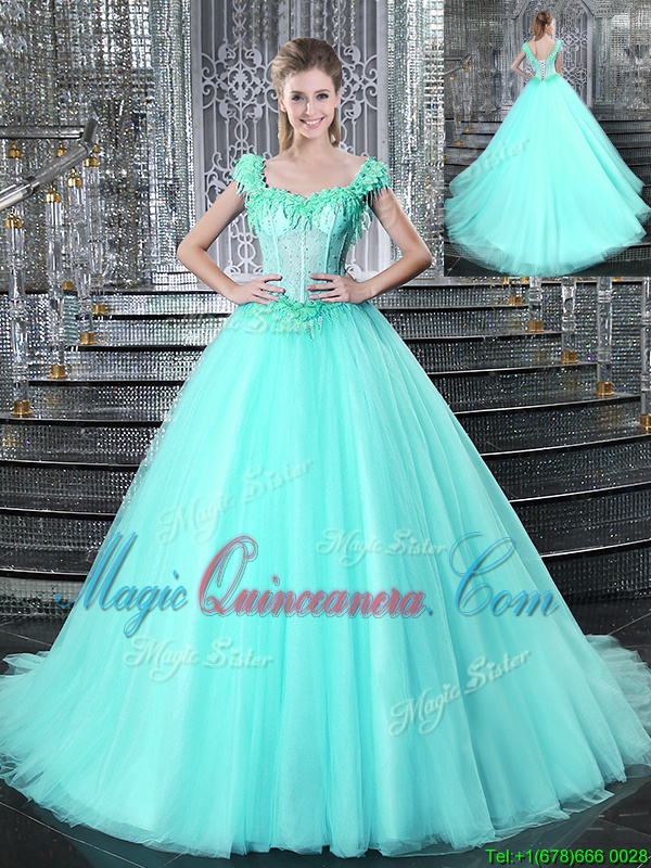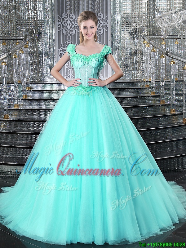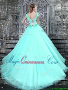 Colorful Straps Straps Aqua Blue Tulle Lace Up Quinceanera Dress Sleeveless With Brush Train Beading and Appliques