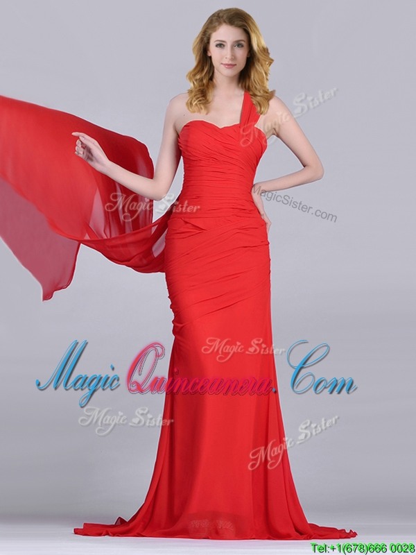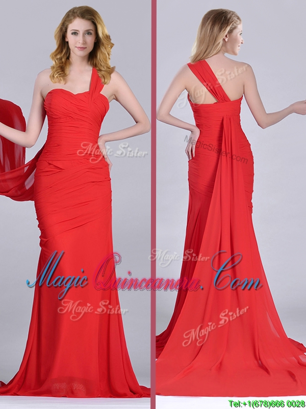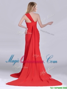Column One Shoulder Watteau Train Coral Red Dama Dress with Side Zipper