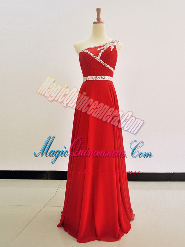 Column/Sheath Prom Party Dress Red One Shoulder Chiffon Sleeveless Floor Length Zipper