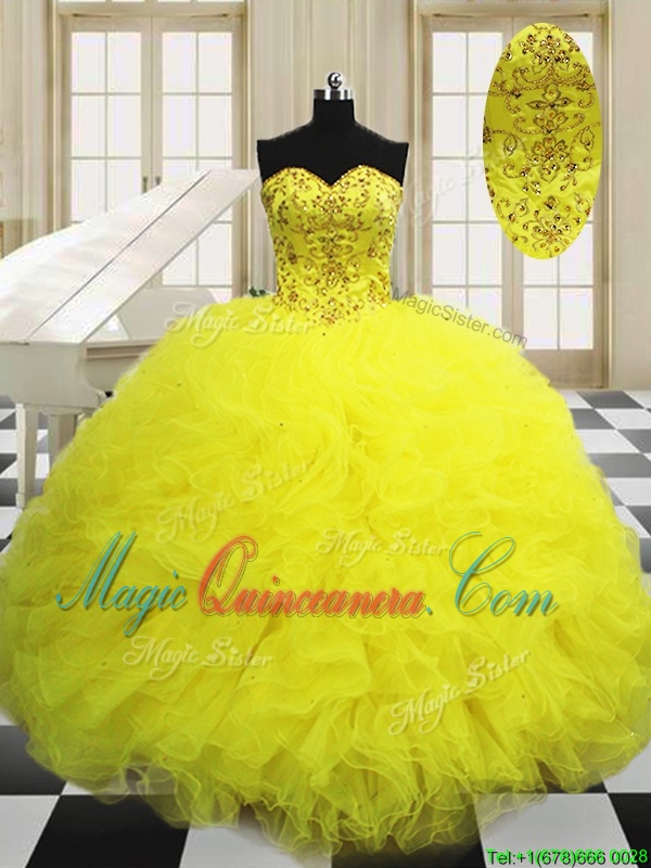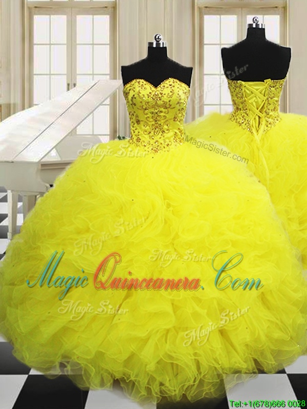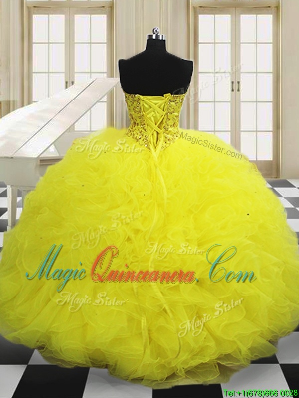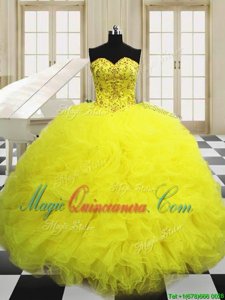 Comfortable Light Yellow Ball Gowns Tulle Sweetheart Sleeveless Beading and Ruffles Floor Length Lace Up Quinceanera Dresses