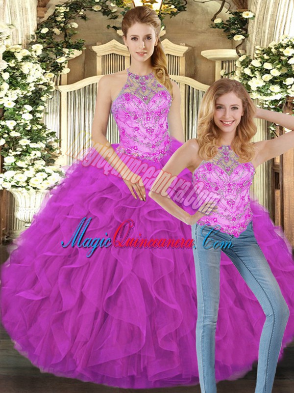 Comfortable Sleeveless Tulle Floor Length Lace Up Sweet 16 Dress in Fuchsia with Beading and Ruffles
