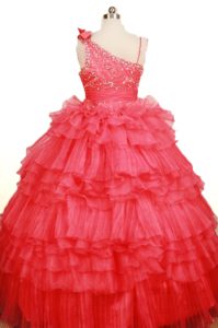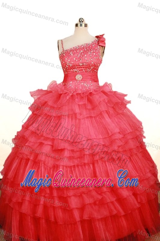 beaded ball gown cheap pageant dresses for juniors, Coral Red Asymmetrical Beaded and Ruffled Little Girl Pageant Dress