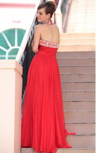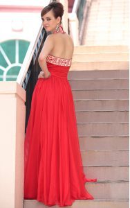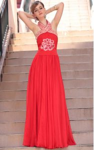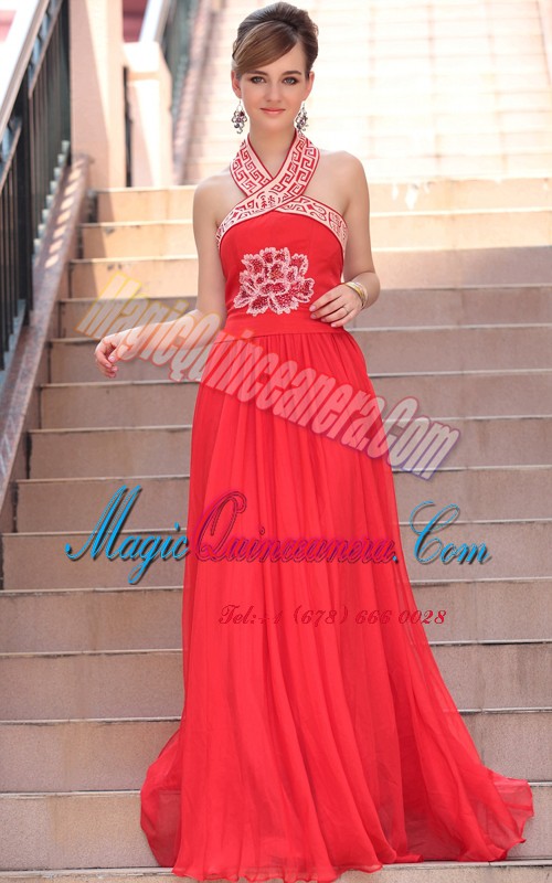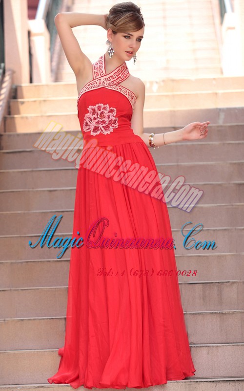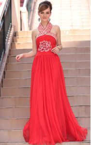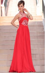 Coral Red Chiffon Side Zipper Halter Top Sleeveless Floor Length Prom Party Dress Embroidery