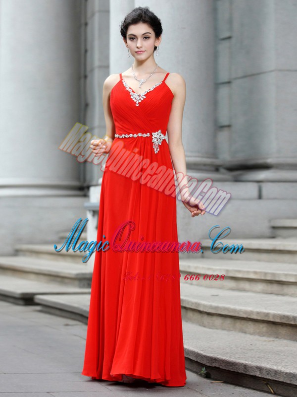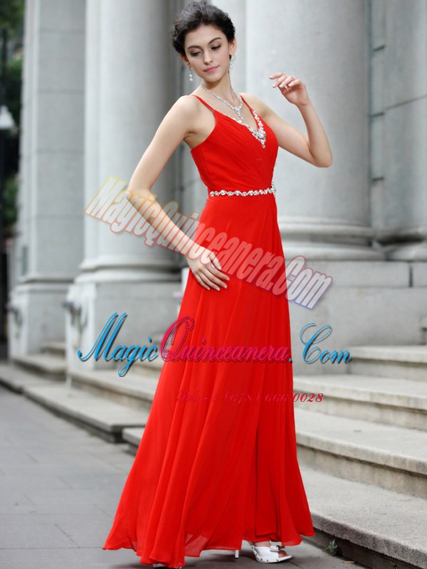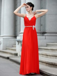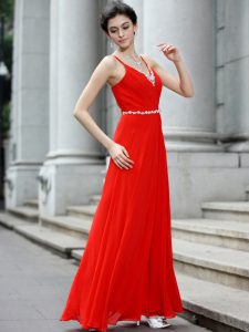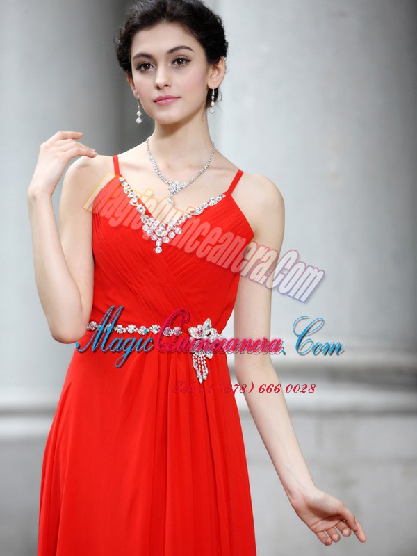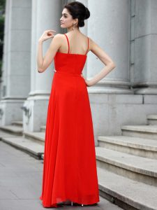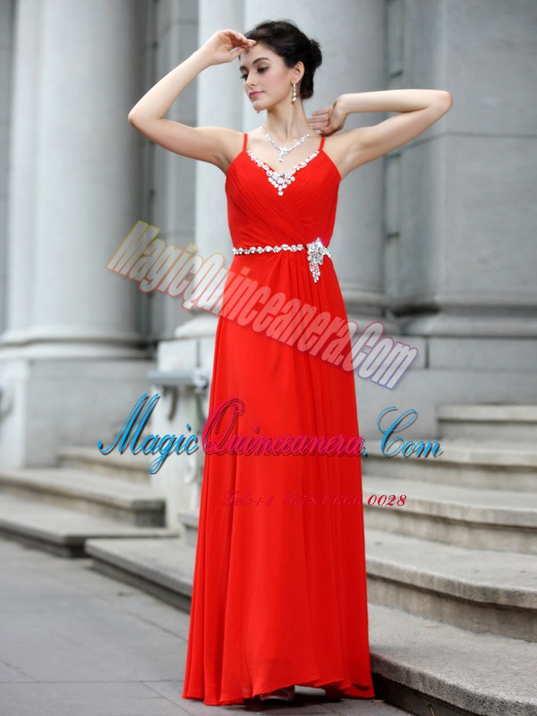 Coral Red Column/Sheath Chiffon Spaghetti Straps Sleeveless Beading Floor Length Zipper Dress for Prom
