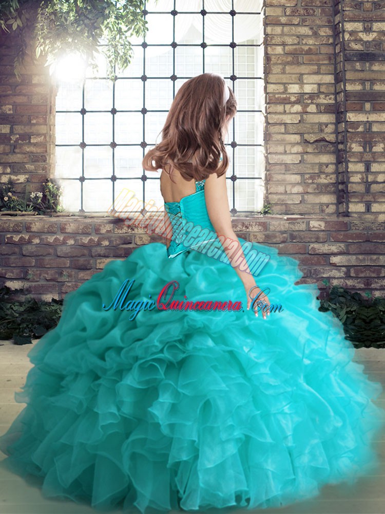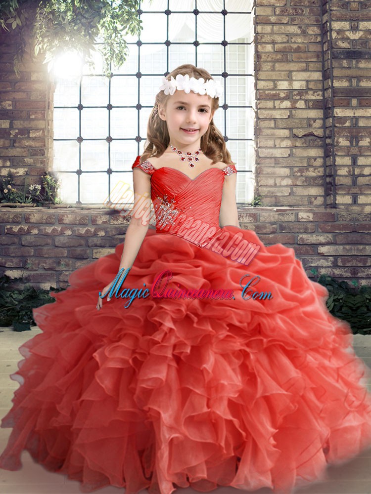 Coral Red Sleeveless Beading and Ruffles and Pick Ups Floor Length Pageant Gowns For Girls