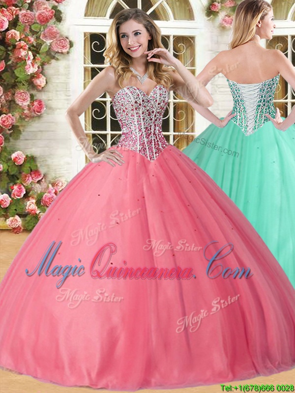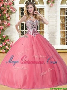 , Coral Red Sleeveless Floor Length Beading Lace Up Quinceanera Gown