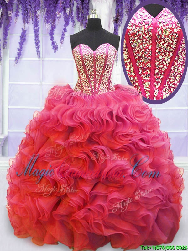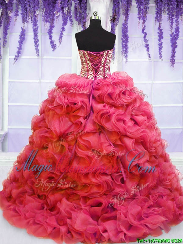 Coral Red Sleeveless Organza Lace Up Ball Gown Prom Dress for Military Ball and Sweet 16 and Quinceanera