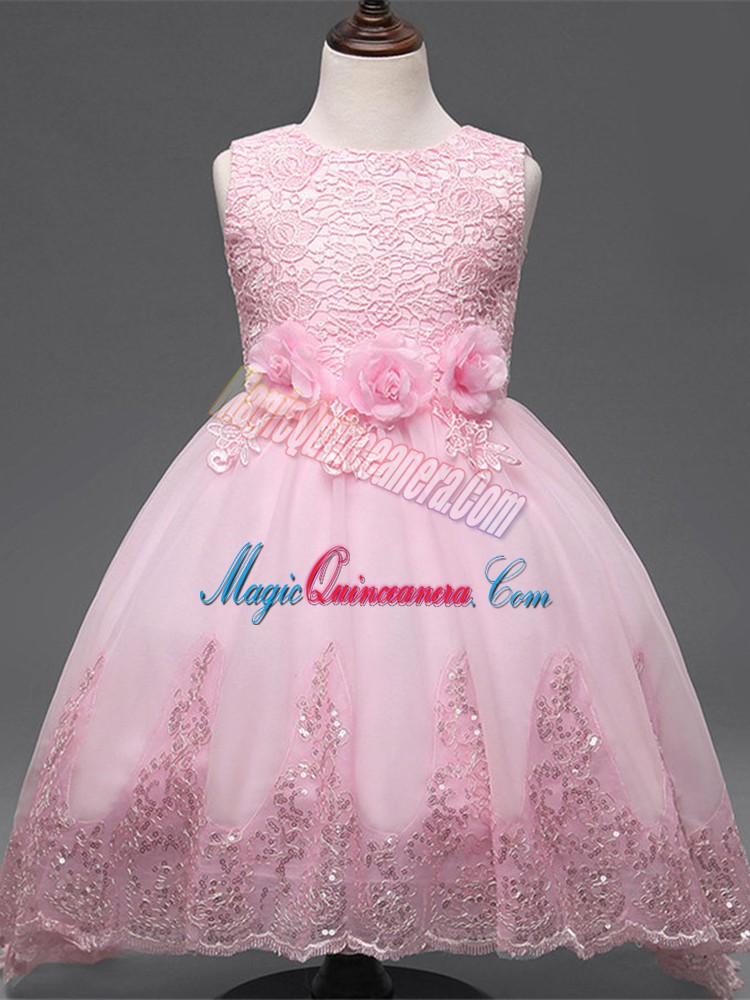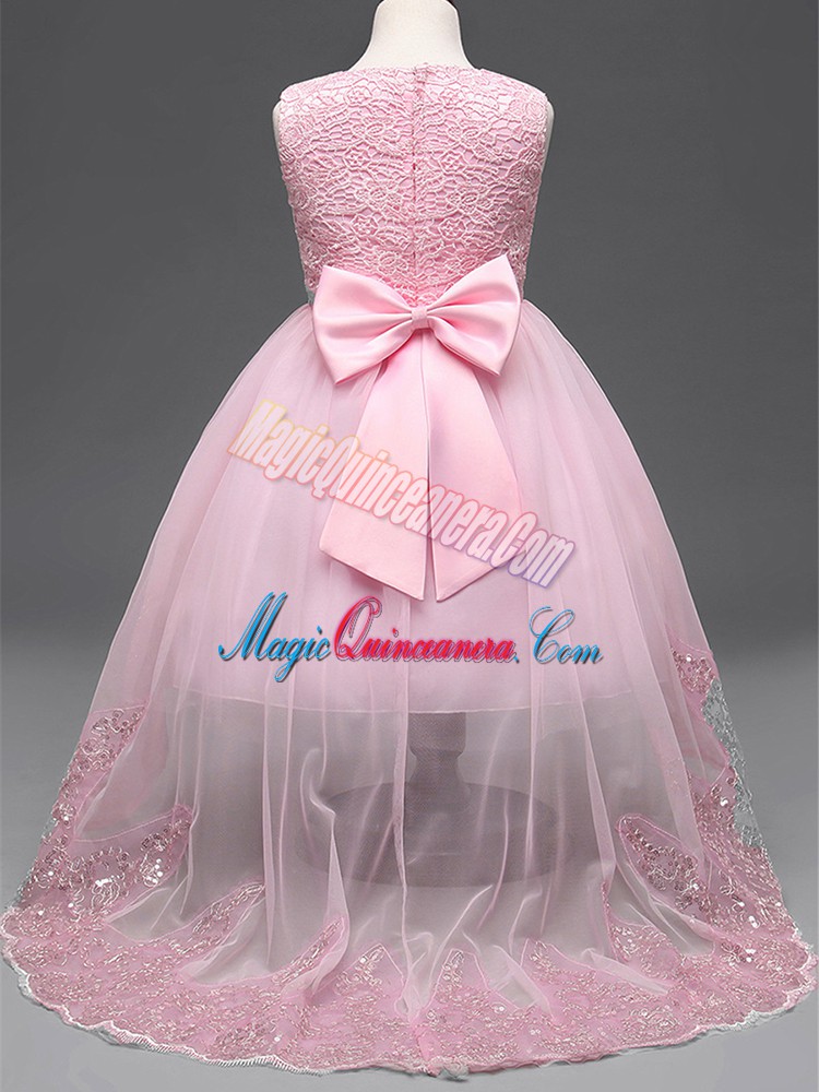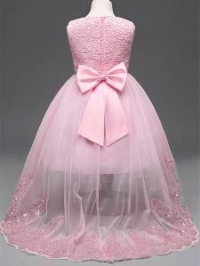 Custom Design Baby Pink Scoop Neckline Lace and Appliques and Bowknot and Hand Made Flower Pageant Dress for Teens Sleeveless Zipper