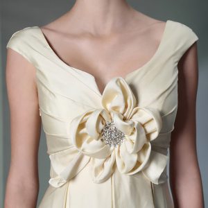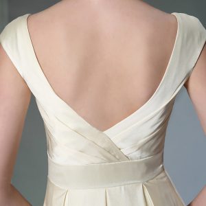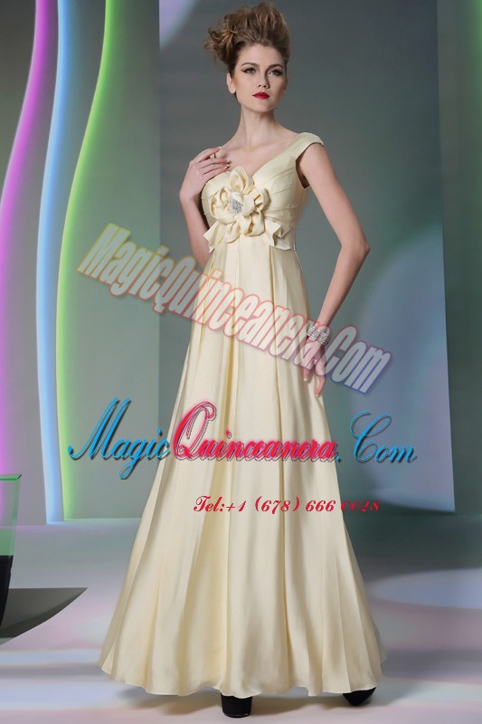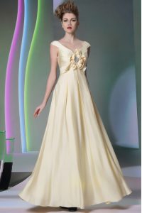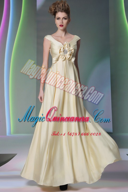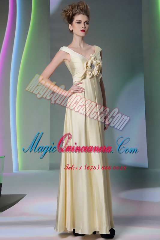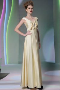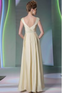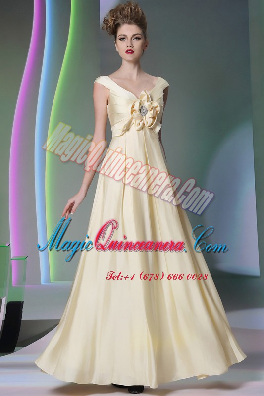 Custom Design Light Yellow Column/Sheath Chiffon Scoop Cap Sleeves Beading and Ruching and Hand Made Flower Floor Length Side Zipper Evening Dress