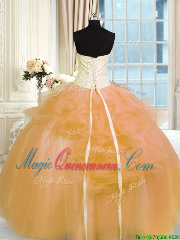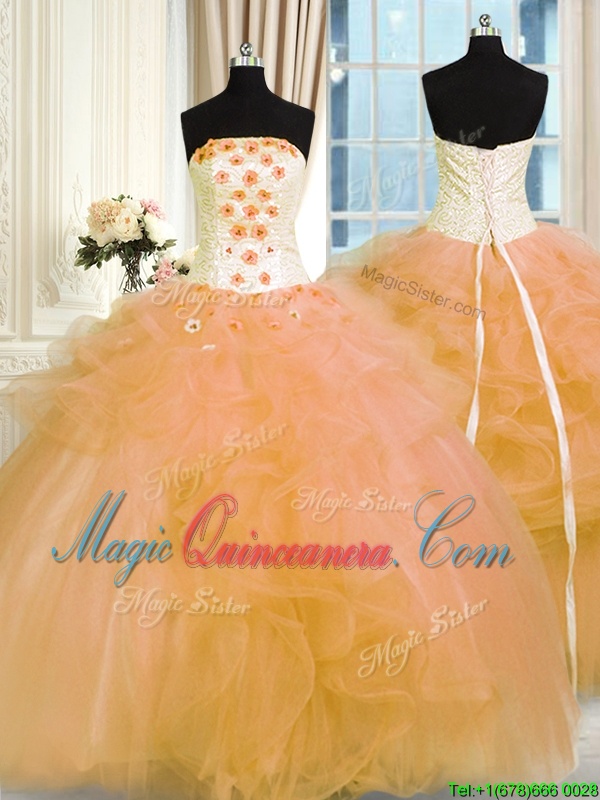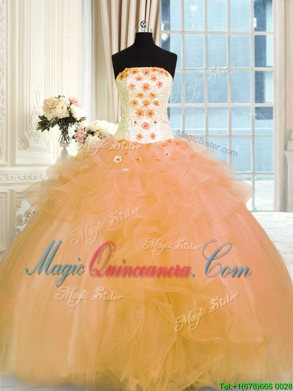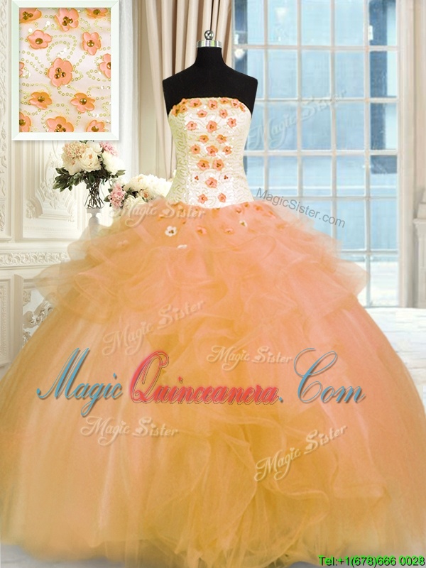 Custom Design Strapless Sleeveless Ball Gown Prom Dress Floor Length Hand Made Flower Gold Tulle
