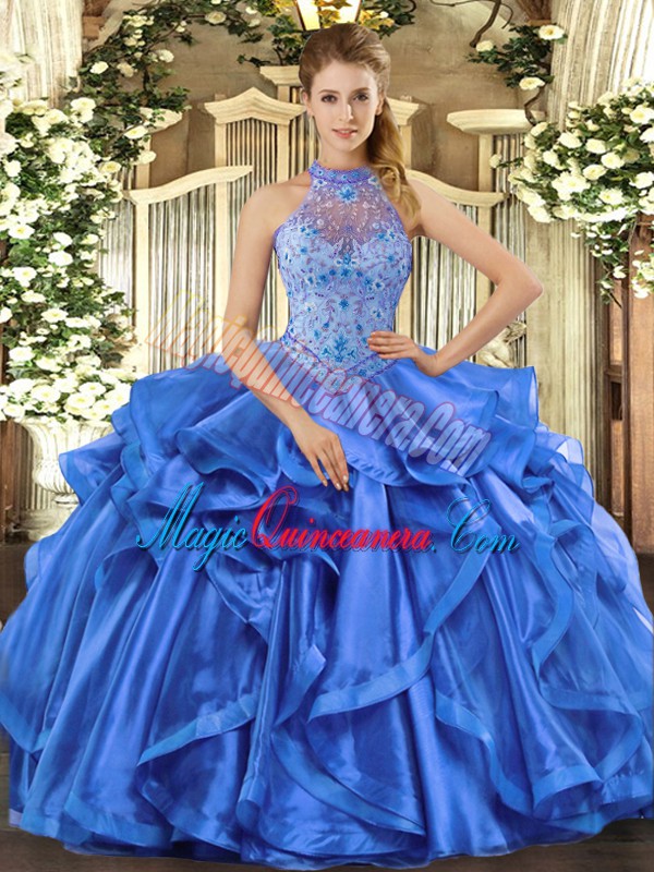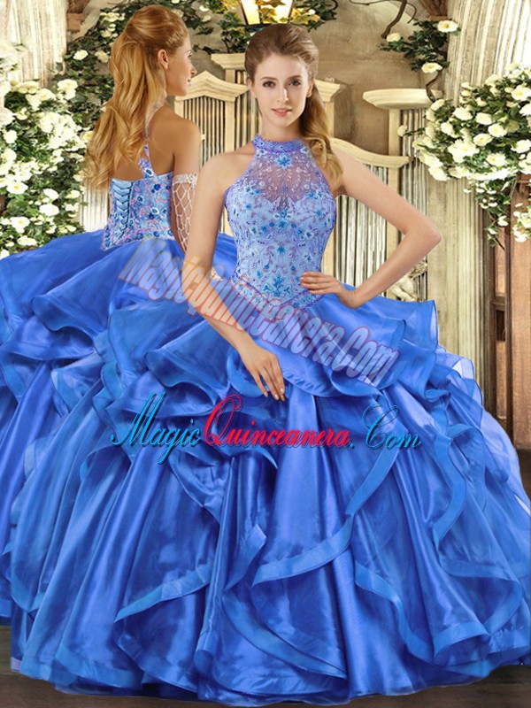 Custom Designed Ball Gowns Sleeveless Blue Ball Gown Prom Dress Lace Up