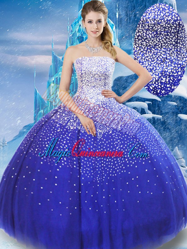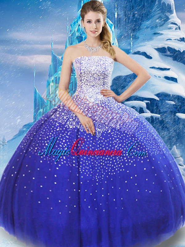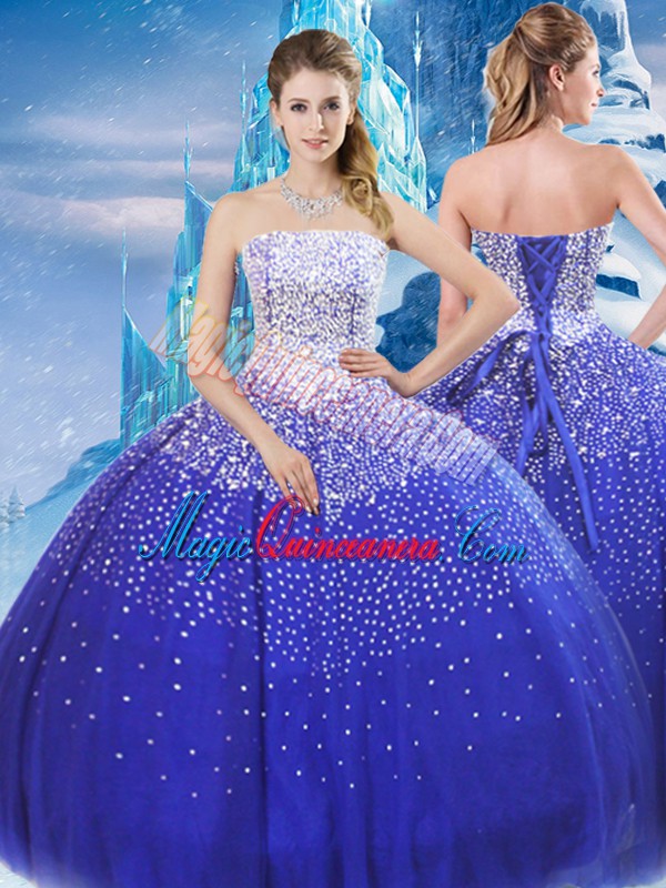 Custom Designed Blue Tulle Lace Up 15th Birthday Dress Sleeveless Floor Length Beading