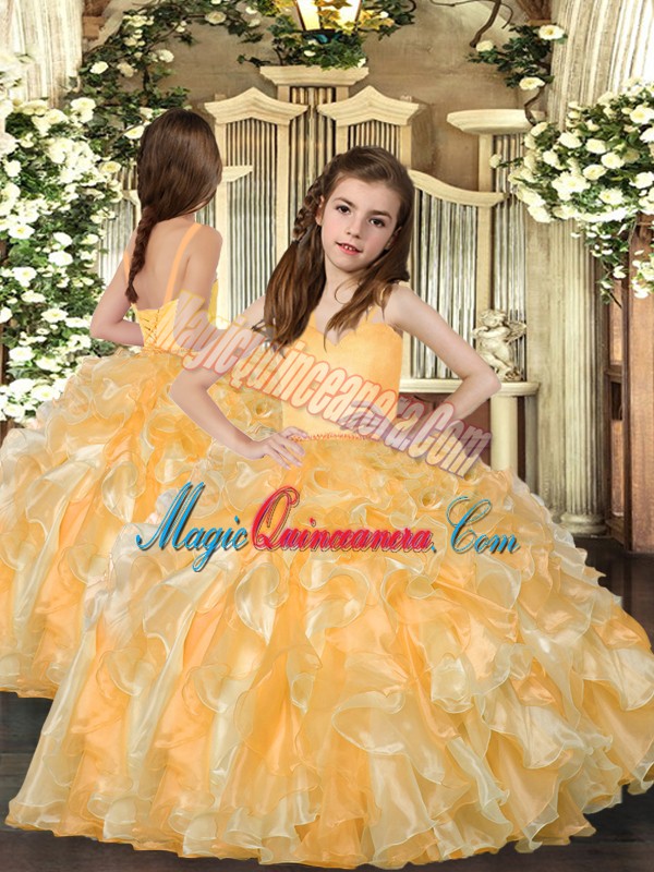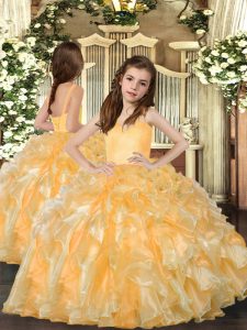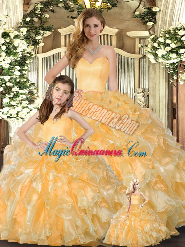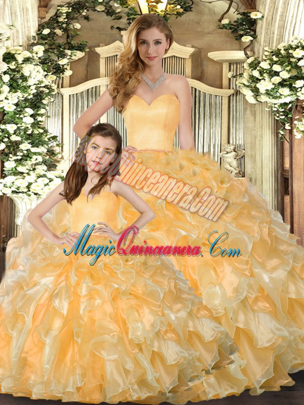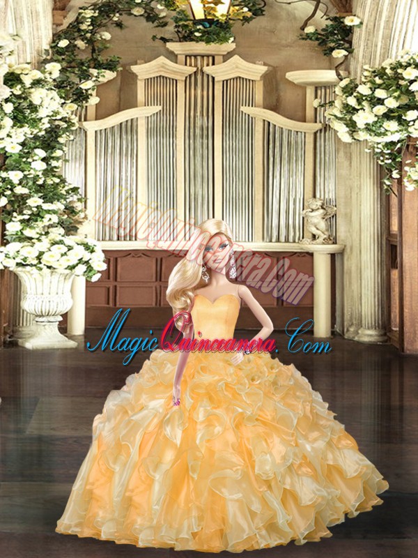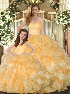 Custom Designed Gold Lace Up Quinceanera Dresses Beading and Ruffles Sleeveless Floor Length