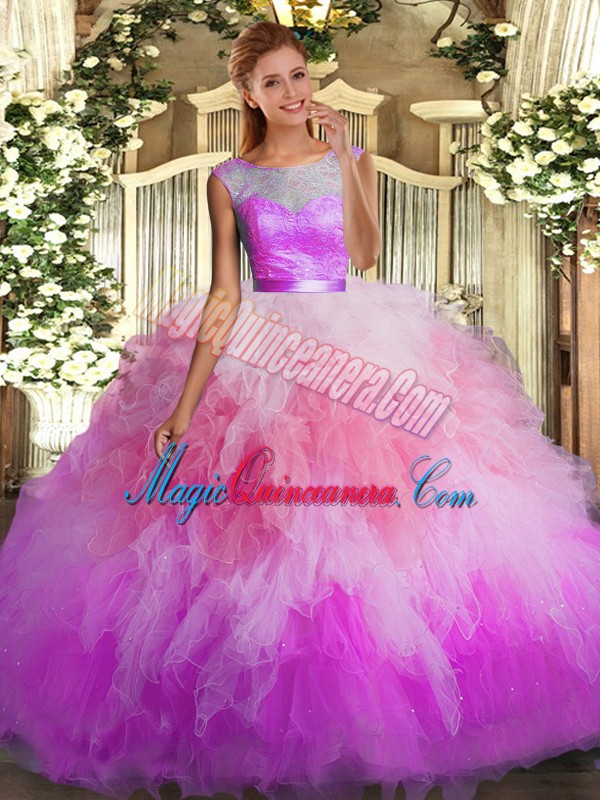 Custom Designed Sleeveless Organza Floor Length Backless Quince Ball Gowns in Multi-color with Lace and Ruffles