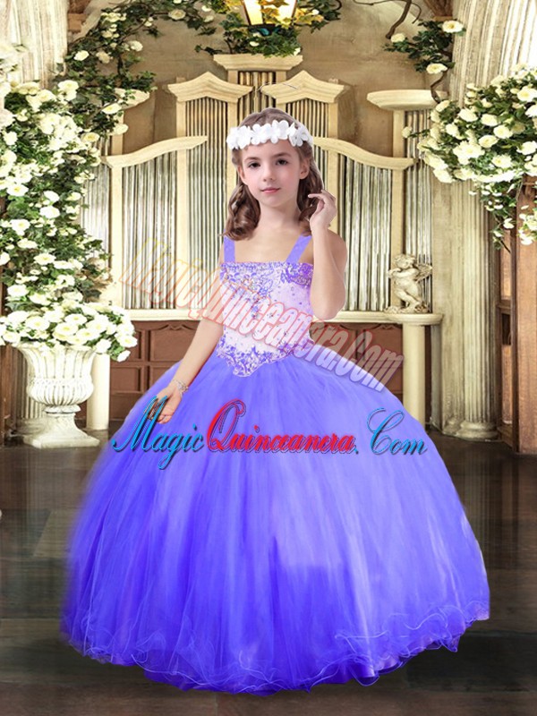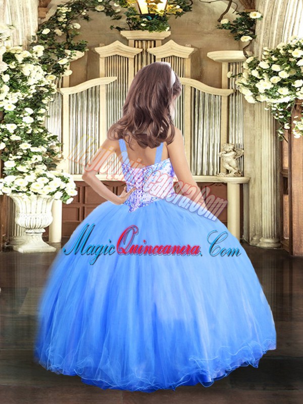 Custom Fit Ball Gowns High School Pageant Dress Blue Straps Tulle Sleeveless Floor Length Lace Up
