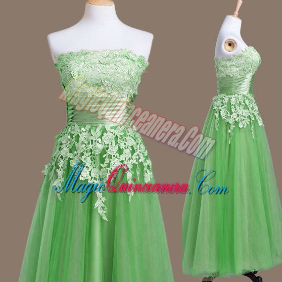 Custom Fit Green Lace Up Dama Dress for Quinceanera Appliques Sleeveless Tea Length