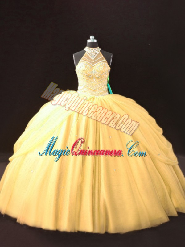 , Custom Fit Halter Top Sleeveless Lace Up Quinceanera Gowns Gold Tulle