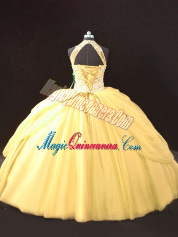 Custom Fit Halter Top Sleeveless Lace Up Quinceanera Gowns Gold Tulle