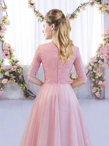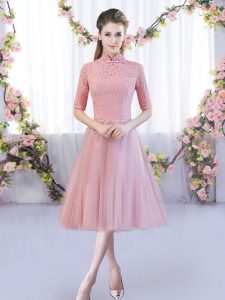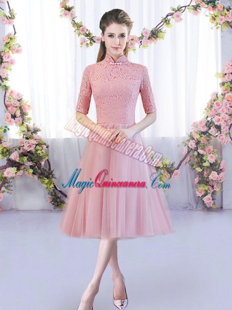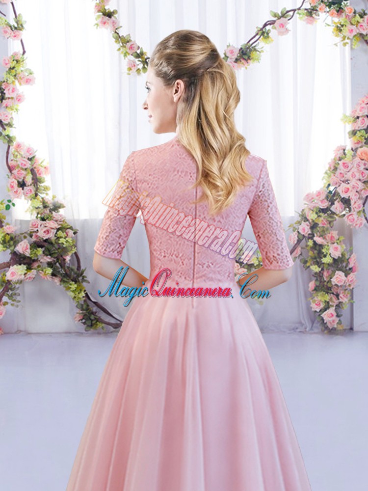 Custom Fit High-neck Half Sleeves Zipper Damas Dress Pink Tulle