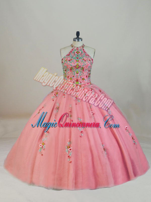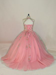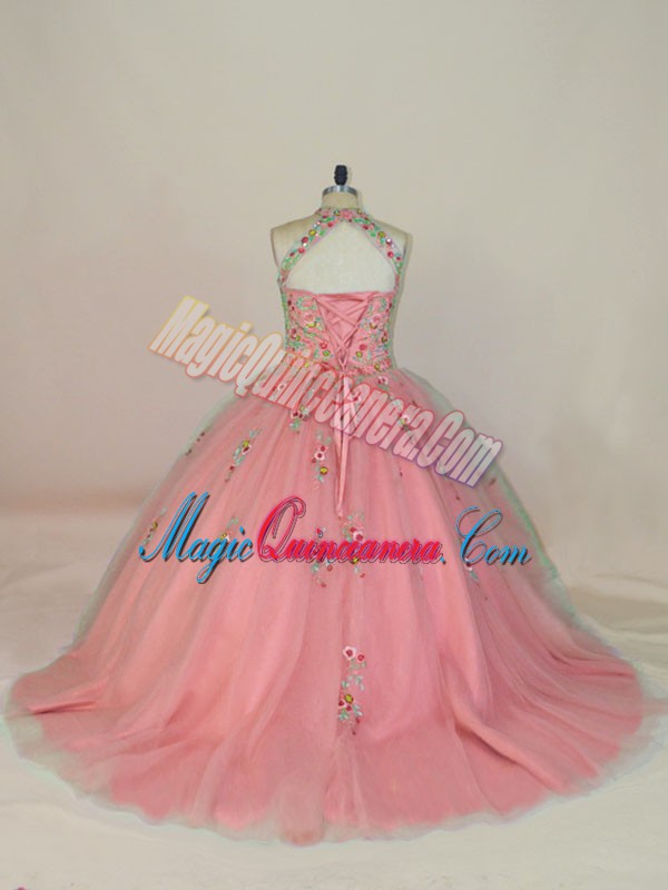 Custom Fit Pink 15th Birthday Dress Tulle Brush Train Sleeveless Appliques and Embroidery