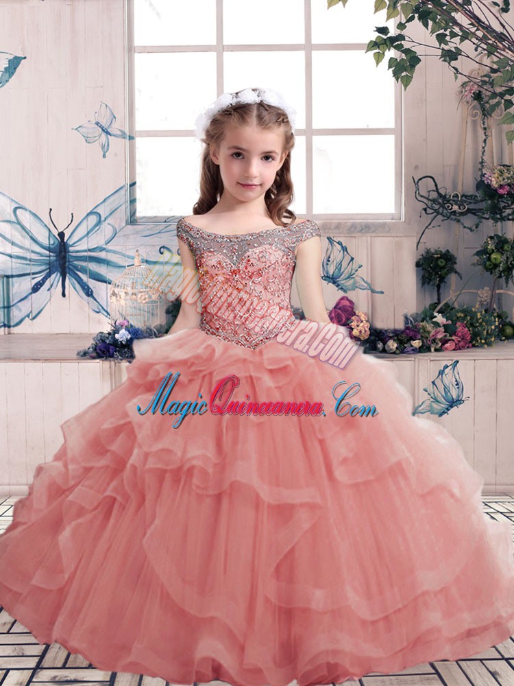 Custom Fit Pink Tulle Lace Up Scoop Sleeveless Floor Length Evening Gowns Beading and Ruffles