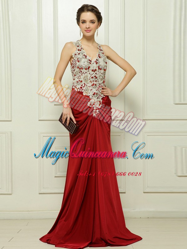 Custom Fit Red Sleeveless With Train Beading and Appliques Zipper Prom Gown