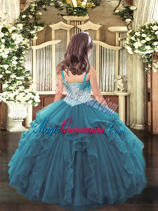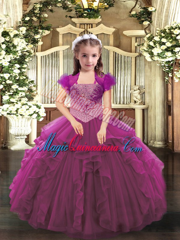 Custom Fit Sleeveless Floor Length Beading and Ruffles Lace Up Pageant Dress for Teens with Fuchsia