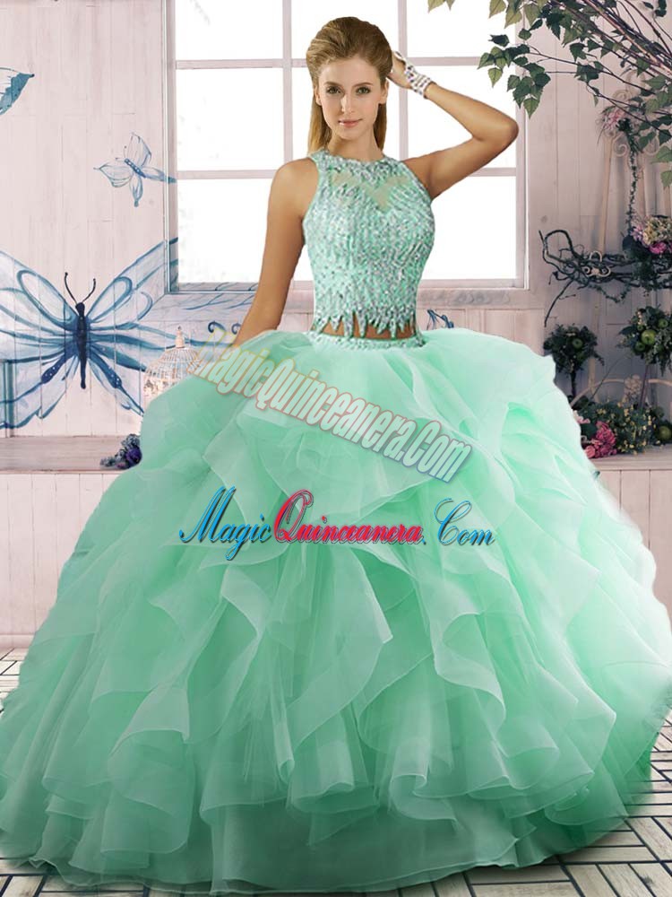 Custom Fit Sleeveless Tulle Floor Length Lace Up Ball Gown Prom Dress in Apple Green with Beading and Ruffles