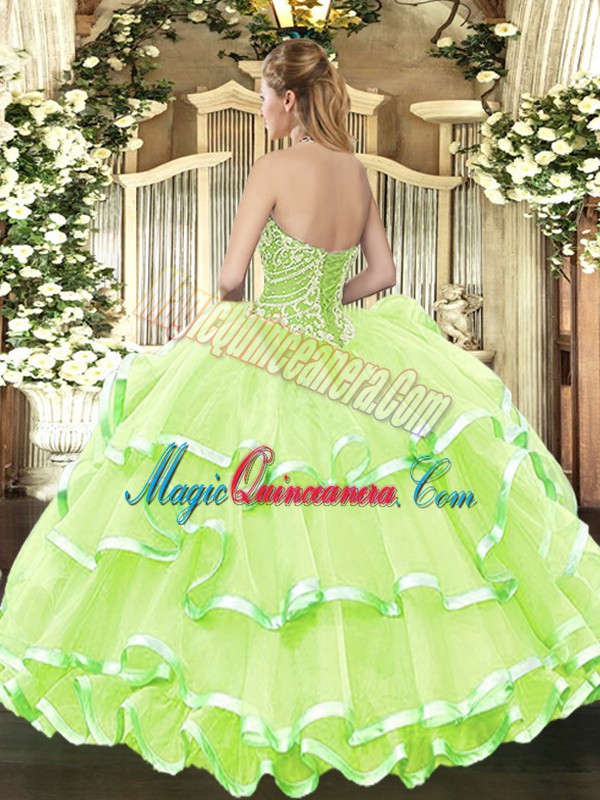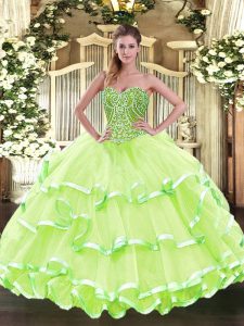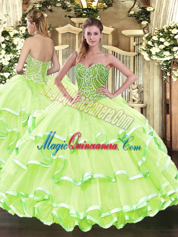 Custom Fit Yellow Green Sleeveless Floor Length Beading and Ruffled Layers Lace Up Quinceanera Gowns