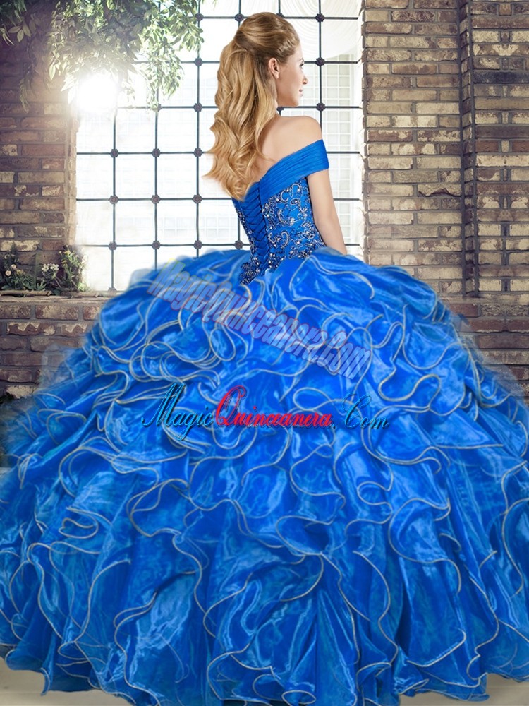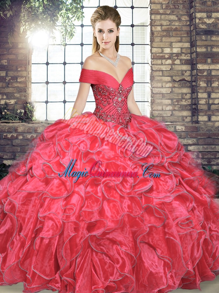 Custom Made Coral Red Off The Shoulder Neckline Beading and Ruffles Ball Gown Prom Dress Sleeveless Lace Up